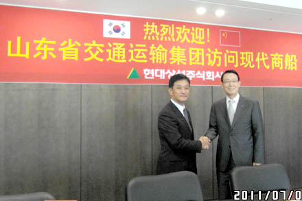 當?shù)貢r間7412時,吳宗昌董事長一行抵達韓國仁川國際機場,韓國現(xiàn)代商船投資規(guī)劃部李京旭副部長在機場迎接。韓國現(xiàn)代商船李碩熙社長在現(xiàn)代集團總部舉行了隆重的歡迎儀式并致辭。李社長指出,他非常感謝今年3月份訪問濟南時山東交運集團給予的熱情款待,隨著雙方的交流增多,雙方的合作不斷引向深入并已取得初步成果,他希望吳宗昌董事長這次訪問成為推進雙方進一步合作新起點和契機。歡迎儀式后,韓國現(xiàn)代商船樸鎮(zhèn)浩部長介紹了韓國現(xiàn)代商船的整體情況。