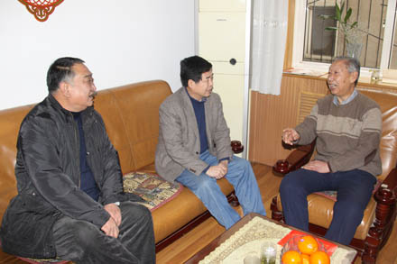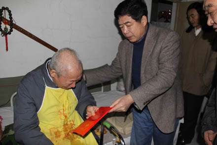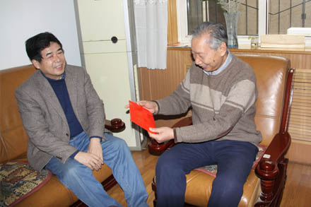 您現(xiàn)在的位置是:首頁 > 集團要聞 省國資委領導走訪慰問集團老黨員 次 集團要聞 發(fā)布時間:2012-01-17 18:55:48 省國資委領導走訪慰問集團老黨員 1月17日上午,省國資委巡視員裴建華一行領導在集團公司董事、工會主席張志堅的陪同下,冒雨來到集團,先后前往離退休老黨員、老干部王德明、鄒全會的家中,親切看望了他們的身體和生活狀況,代表省國資委向他們贈送了慰問金,并祝福他們安度晚年、新春愉快。省國資委機關黨委專職副書記王在新、離休干部處調(diào)研員王萬珂參加了走訪慰問。 (黨委組宣部、老干部)
