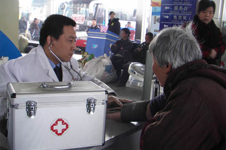 車站醫(yī)務(wù)室黨員魏德泉在候車長廊內(nèi)設(shè)立了便民醫(yī)療咨詢服務(wù)站,為乘車旅客提供便民服務(wù)。