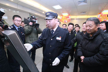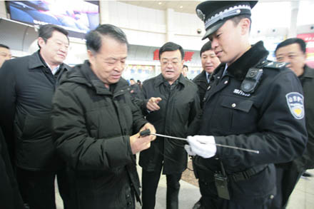 楊傳堂部長特別叮囑車站工作人員說:“安全檢查是車站服務的第一道關口,要充分利用人防、物防、技防等綜合手段加強關口職能到位,要牢固樹立安全第一的觀念,確保旅客乘車安全。”