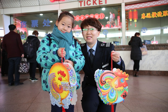 “雞”祥燈籠照亮旅途  近日,在濟南長途汽車總站乘車的高研欣小朋友開心地收到售票員送上的祥燈籠,這是總站為配合元宵節運輸開展的“唱兒歌送吉祥”活動,活動規定從即日起至正月十五,凡在總站購票的小朋友,只要能唱出與元宵節相關的兒歌,即可獲贈祥燈籠一個,為旅途增添節日了一份節日的歡樂。