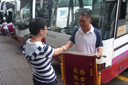 2012年7月2日,第一客運(yùn)公司濟(jì)南至曲阜線路魯A46982駕駛員史元成同志,駕車抵達(dá)曲阜客運(yùn)站,在整理車內(nèi)衛(wèi)生時(shí),發(fā)現(xiàn)有旅客遺落在車內(nèi)的筆記本電腦一臺(tái)。史元成同志立即通知曲阜客運(yùn)站,并設(shè)法尋找到了失主曲阜孔女士。孔女士接過筆記本電腦后萬(wàn)分激動(dòng),當(dāng)場(chǎng)拿出兩條香煙以示謝意,被史元成同志婉言謝絕,并表示這是身為山東交運(yùn)一名普通駕駛員應(yīng)該做的??着渴指袆?dòng),對(duì)史元成同志這種拾金不昧的高尚品德和良好的職業(yè)情操表示贊許:“山東交運(yùn)能夠有像史師傅這樣的優(yōu)秀駕駛員,也反映出你們公司是真正的誠(chéng)信經(jīng)營(yíng)、熱情服務(wù)。我信任你們!”