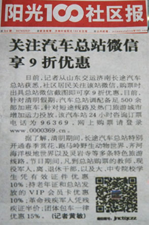與此同時(shí),總站充分利用身邊的優(yōu)勢(shì)資源,積極拓展新方式,與陽(yáng)光100社區(qū)達(dá)成合作意向,將總站班次信息和優(yōu)惠舉措刊登在社區(qū)報(bào)上。該社區(qū)報(bào)覆蓋小區(qū)受眾3萬(wàn)余人次,不僅達(dá)到了宣傳總站班次及服務(wù)的良好效果,同時(shí)也探求了營(yíng)銷(xiāo)新方式,拓展了營(yíng)銷(xiāo)思路。